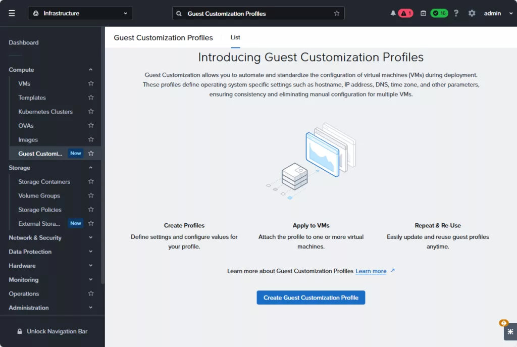 Ready? Let’s go into Prism Central and navigate to Compute –> Guest Customization Profiles –> And click: Create Guest Customization Profile.