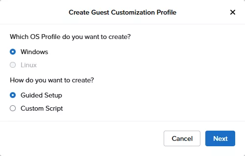 Select Windows and Guided Setup. You can chose Custom Script but then you need to upload your, already created, xml file. The Linux version will follow later.