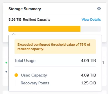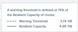 As you can see I have a three node cluster with a total storage capacity of 7.87TiB and, as the nodes are equal, per node it is 2.62TiB. This is the physical capacity. So we are not counting (for example) Replication Factor 2. The Resilient Capacity is 4.98TiB. This is the total cluster capacity minus 1 node (If running RF3 it is minus 2 nodes). So I can safely store approx 4.98TiB on the cluster and then a node can go down. There will be a warning triggered when the cluster is passing the 75% threshold of the resilient capacity. On the test cluster that is 3.74TiB. (This 75% threshold is configurable)